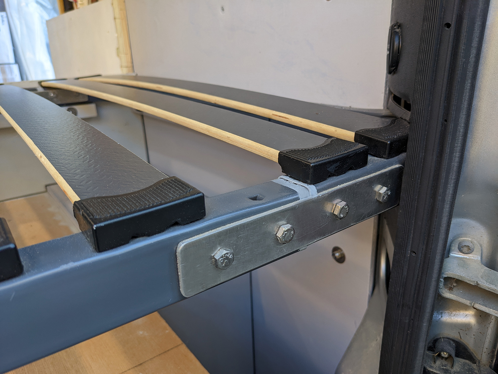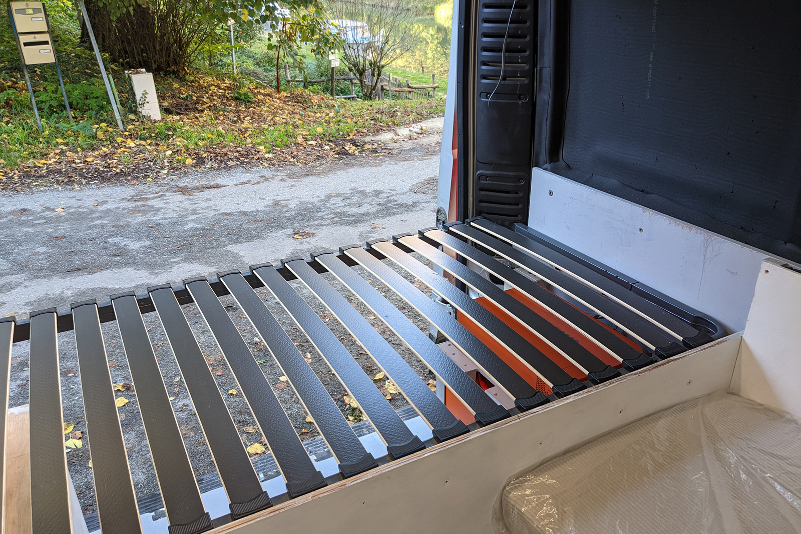 Création d’un premier lit, transversal, à l’arrière,à partir d’un sommier à lattes de largeur 80 cm, posé sur les cloisons.