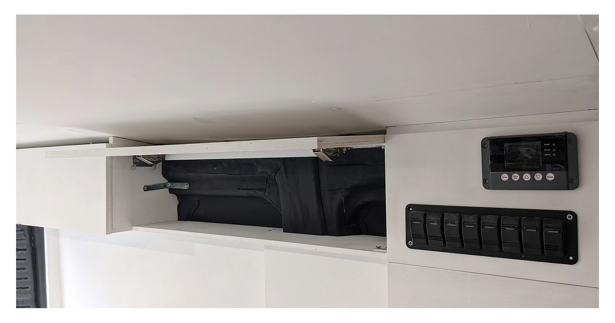 Sur ce fourgon à la hauteur limitée, les placards sont de dimension modeste.  Celui du fond pour conserver une hauteur acceptable au dessus du lit, et le second, encore  réduit en profondeur, pour que la tête de la personne assise sur la banquette du coin repas ne le touche pas … Sur un fourgon L1H1, chaque centimètre compte !!! …  😉